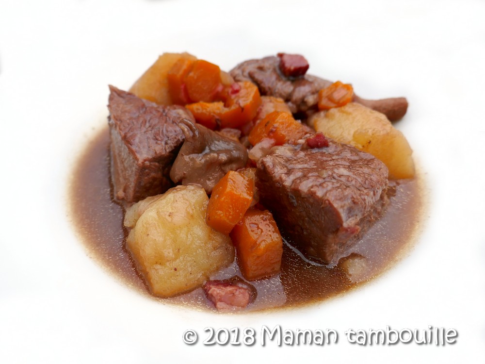 Cependant il faut prendre le temps et cest important de bien faire mijoter la préparation pendant 3 heures afin davoir quelque chose de fondant autant sur la viande que sur les légumes. 500 g de champignons de Paris. 400g de viande à bourguignon 1 à soupe de farine 50g de lardons 1 bouquet garni 200 ml de vin rouge 1 carotte sel poivre 4 à 6 pommes de terre selon la taille épluchées et couper en morceaux 100 ml de fond de fond.